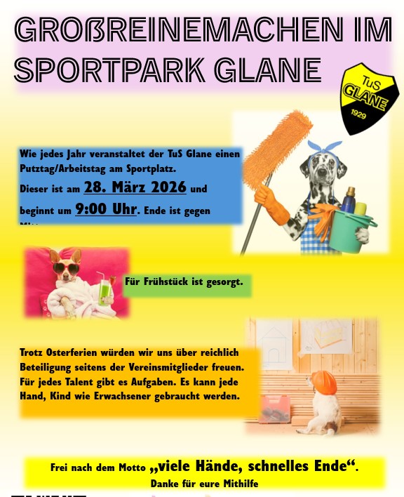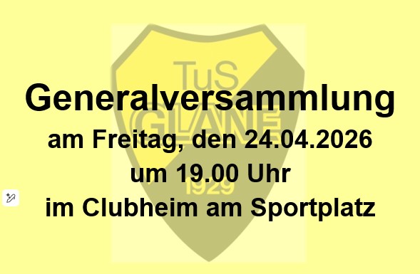 Einladung für alle Mitglieder: Generalversammlung TuS Glane im Clubheim Sportpark 24.04.2026 19:00 Uhr
