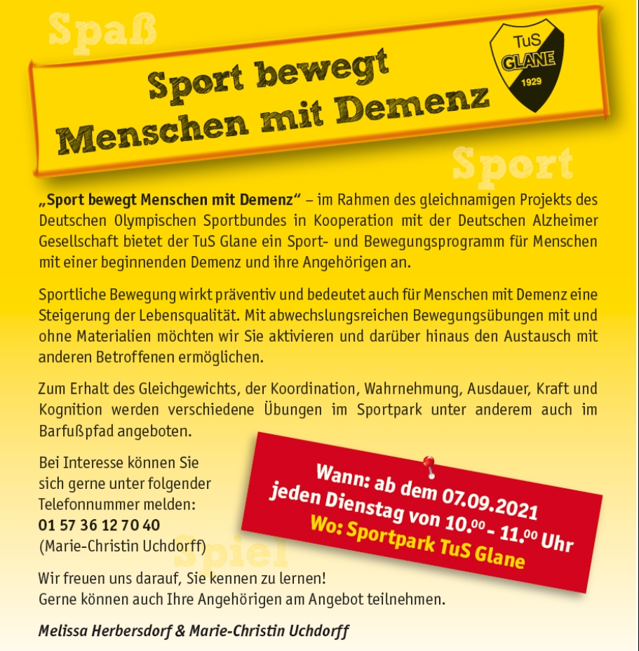 „Sport bewegt Menschen mit Demenz“ – im Rahmen des gleichnamigen Projekts des Deutschen Olympischen Sportbundes in Kooperation mit der Deutschen Alzheimer Gesellschaft bietet der TuS Glane ein Sport- und Bewegungsprogramm für Menschen mit einer beginnenden Demenz und ihre Angehörigen an. ...