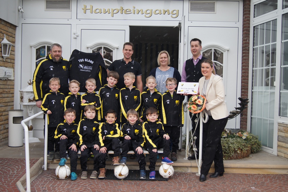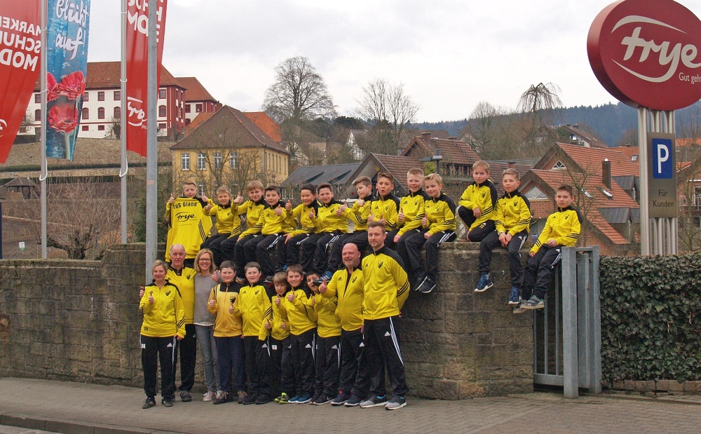 In schönen neuen Trainingsanzügen präsentierten sich am Freitag, 09. März 2018, die E1- und die E2-Fußballer des TUS Glane im Schuhhaus Frye.