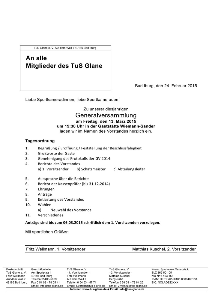 Am 13.. März um 19:30 Uhr findet die jährliche Mitgliederversammlung des TuS Glane im Gasthaus Wiemann-Sander in Bad Iburg-Glane statt.
