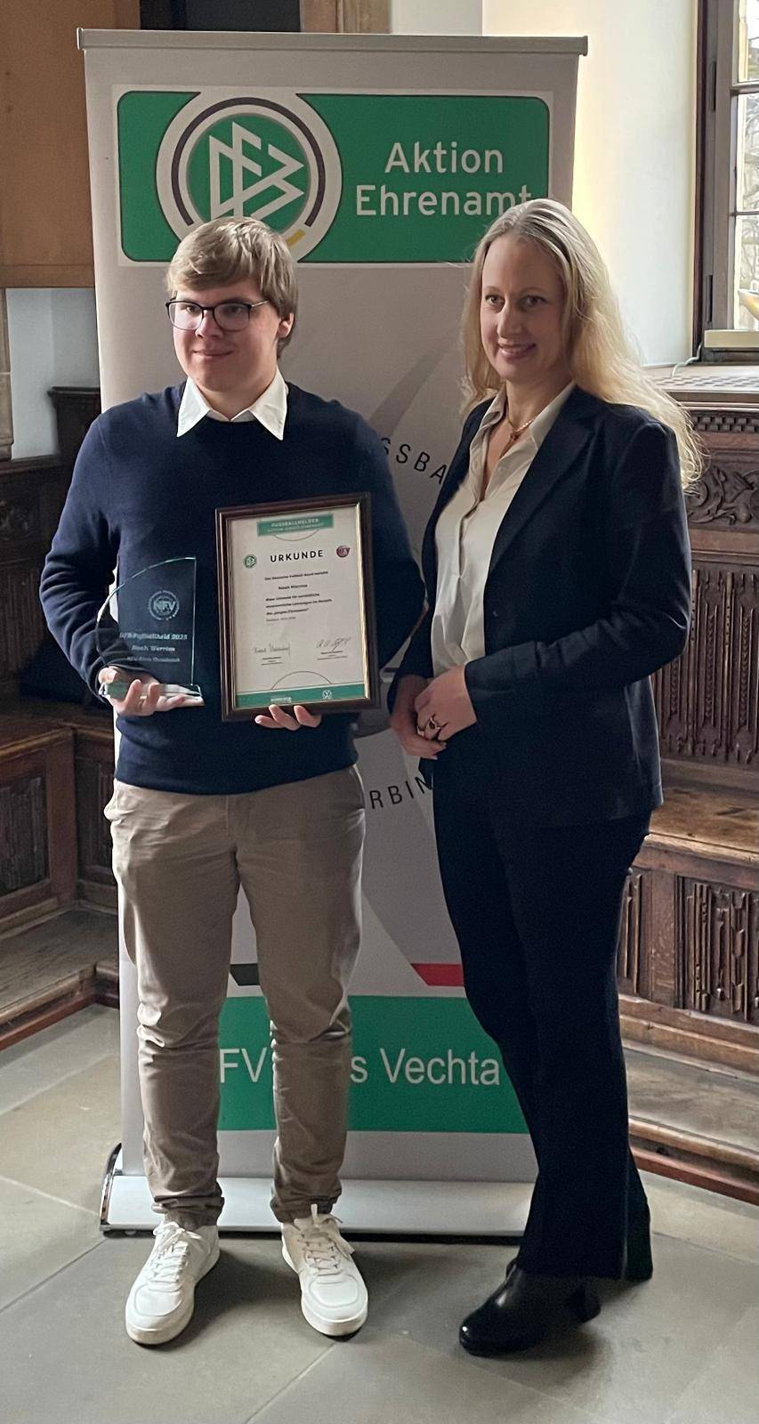 Menschen, die im Verein viele verschiedene Aufgaben ohne finanzielle Entschädigung und mit großer Leidenschaft übernehmen sind unverzichtbar. So ein Mensch ist Noah Werries vom TuS Glane. Für sein umfangreiches Engagement rund um die Fußballabteilung seines Vereins wurde der 19 Jährige jetzt vom Deutschen Fußball Bund (DFB) zum Fußballhelden gekürt. Im Friedenssaal des Osnabrücker Rathauses überreichte Landrätin Anna Kebschull dem Kreissieger in der Kategorie „Fußballhelden“ die Urkunde des DFB´s, der mit diesem Preis junge Ehrenamtliche im Alter von 18 bis 30 Jahre ehrt. Noah Werries ist in der Fußballabteilung des TuS Glane als Jugendtrainer aktiv und engagiert sich in jedem Jahr unter anderem bei der Durchführung des beliebten Fußballcamps. Auch bei der Durchführung der großartigen Aktion zugunsten Isabellas war er dabei. Die Mitwirkung im neu gegründeten Jugendvorstand des TuS Glane ist für ihn selbstverständlich.