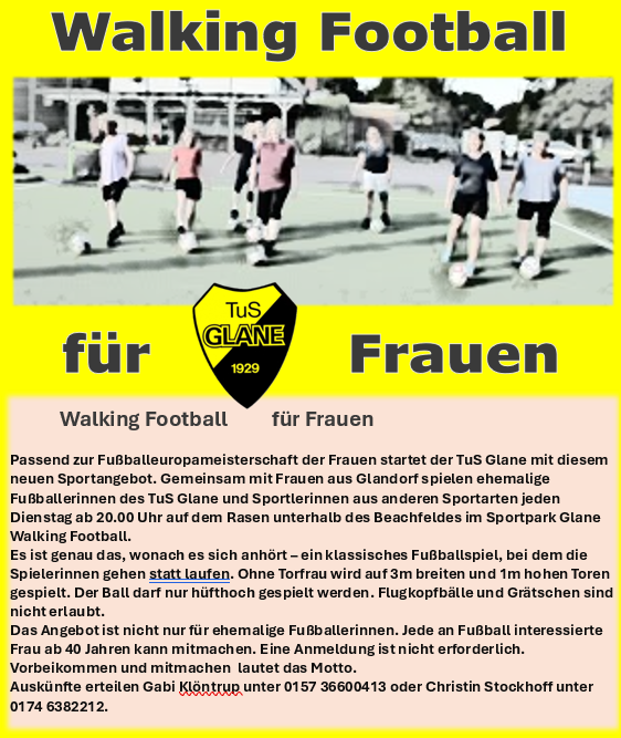 Walking Football für Frauen – passend zur Fußballeuropameisterschaft der Frauen startet der TuS Glane mit diesem neuen Sportangebot. Gemeinsam mit Frauen aus Glandorf spielen ehemalige Fußballerinnen des TuS Glane und Sportlerinnen aus anderen Sportarten jeden Dienstag ab 20.00 Uhr auf dem Rasen unterhalb des Beachfeldes im Sportpark Glane Walking Football. Es ist genau das, wonach es sich anhört – ein klassisches Fußballspiel, bei dem die Spielerinnen gehen statt laufen. Ohne Torfrau wird auf 3m breiten und 1m hohen Toren gespielt. Der Ball darf nur hüfthoch gespielt werden. Flugkopfbälle und Grätschen sind nicht erlaubt. Das Angebot ist nicht nur für ehemalige Fußballerinnen. Jede an Fußball interessierte Frau ab 40 Jahren kann mitmachen. Eine Anmeldung ist nicht erforderlich. Vorbeikommen und mitmachen lautet das Motto. Auskünfte erteilen Gabi Klöntrup unter 015736600413 oder Christin Stockhoff unter 01746382212.