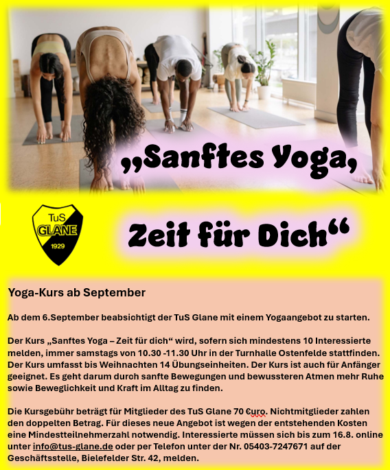 Ab dem 6.September beabsichtigt der TuS Glane mit einem Yogaangebot zu starten. Der Kurs „Sanftes Yoga – Zeit für dich“ wird, sofern sich mindestens 10 Interessierte melden, immer Samstags von 10.30 -11.30 Uhr in der Turnhalle Ostenfelde stattfinden. Der Kurs umfasst bis Weihnachten 14 Übungseinheiten. Der Kurs ist auch für Anfänger geeignet. Es geht darum durch sanfte Bewegungen und bewussteren Atmen mehr Ruhe sowie Beweglichkeit und Kraft im Alltag zu finden. Die Kursgebühr beträgt für Mitglieder des TuS Glane 70 €uro. Nichtmitglieder zahlen den doppelten Betrag. Für dieses neue Angebot ist wegen der entstehenden Kosten eine Mindestteilnehmerzahl notwendig. Interessierte müssen sich bis zum 16.8. online unter