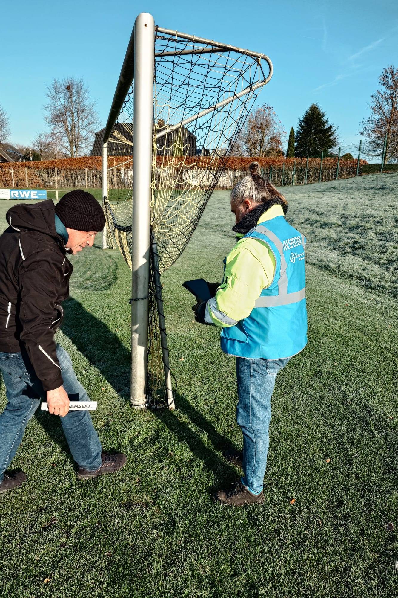Bild 2: Prüfung Fußballtor – Martin Kuttig und Paul Bergmann schauen ganz genau hin.