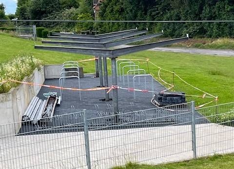 Besonders attraktiv wird der zentrale Fahrradstellplatz neben dem Mehrgenerationenspielplatz, wenn dessen Überdachung aufgebaut wird. Die Stadt Bad Iburg hat das Vorhaben des Vereins unterstützt und den ehrenamtlichen Aktivisten erlaubt, den Fahrradunterstand an der alten Grundschule abzubauen und für den Sportpark wiederzuverwenden. Wiederverwendet wurden bei dieser Maßnahme auch die teils 1,50m hohen L-Steine, die der TuS schon vor Jahren vor dem Schredder bewahrt hat.