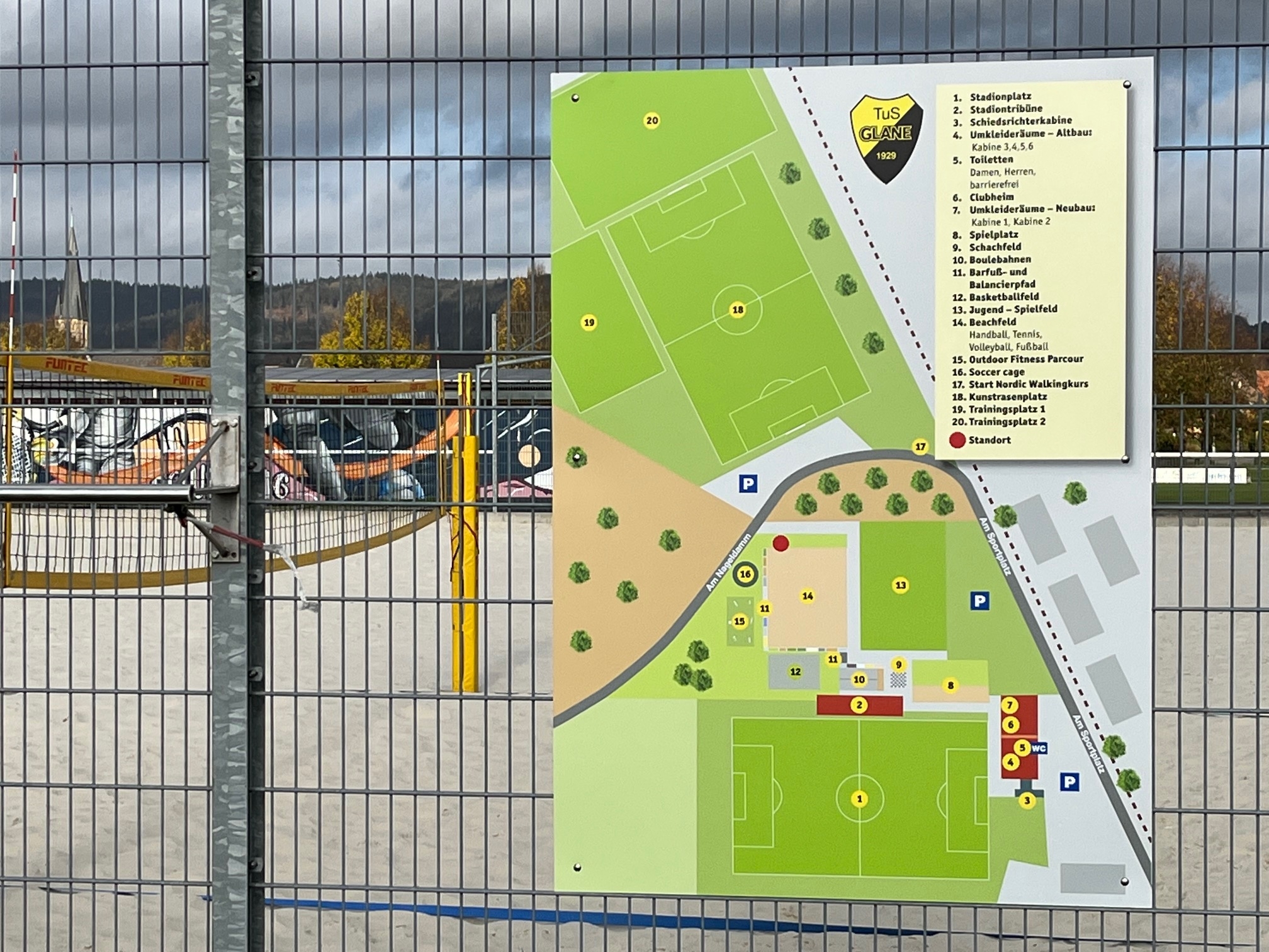 Kontinuierlich baut der TuS Glane seinen Sportpark aus. „Immer wieder fragten uns Besucher und Nutzer der multifunktionalen Sportanlage nach dem Weg zur Toilette oder zu einer bestimmten Sportstätte. Dem Vorstand wurde schnell klar, dass zur besseren Orientierung eine Beschilderung notwendig ...