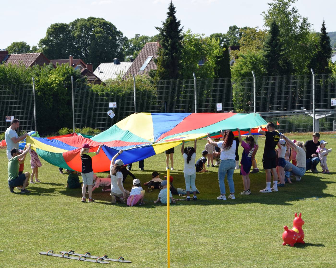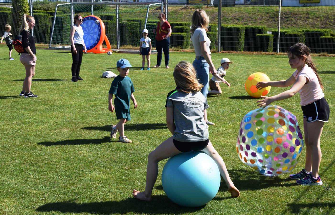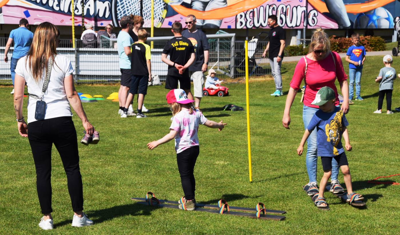 „Cool“ war die einhellige Antwort aller Kinder auf die Frage „Wie gefällt dir der Spielenachmittag?“ Das herrlich sonnige Frühlingswetter lockte 150 Kinder mit ihren Familien in den Sportpark Glane. Dort hatte das Organisationsteam um Vorstandsmitglied Simone Kuschel zahlreiche Stationen aufgebaut, an denen die Kinder nach Herzenslust unterschiedliche Sportarten ausprobieren konnten. Unter den Augen staunender Großeltern zeigten die Kinder ihre individuellen Fähigkeiten beim Balancieren, Werfen oder Hüpfen. Gemeinsam mit den Eltern wurde auf dem Schwungtuch der große Ball in Bewegung gehalten. Frei nach dem Vereinsmotto „Gemeinsam in Bewegung“ animierte Nicole Maibaum die Kinder zu einer Tanzeinlage. Zwischen den Spielen fanden die frisch gebackenen Waffeln der engagierten Helferinnen reißenden Absatz.