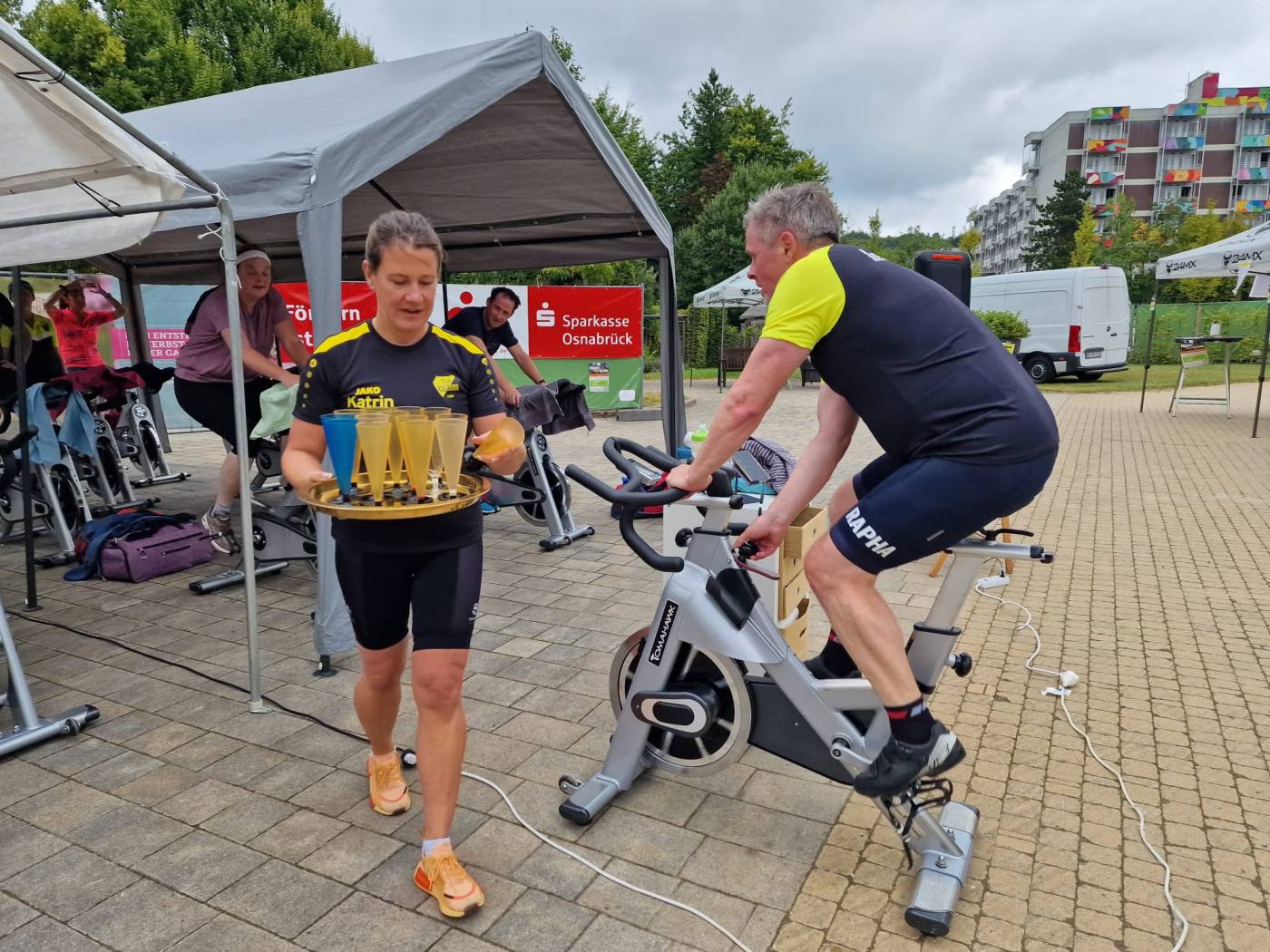 Auf dem Europaplatz unterhalb des Baumwipfelpfades fuhren erfahrene Cycling-Fahrer/innen aus den Reihen des Vereins und externe Marathonfahrer/innen aus Harsewinkel, Lingen und Havixbeck. Auf 15 Spinningrädern wurden die neunzig freien Plätze im stündlichen Wechsel von fünfzig Fahrern besetzt. Sechs intensive Stunden mit unterschiedlichen Musikstilen, wie z.B. die 90er, Bella Italia und Hollywood hielten die teilnehmenden Fahrer/innen auf Trab. Bei besten Wetterverhältnissen fuhr der ein oder andere seine zweite, dritte oder sogar vierte Stunde. Eine Teilnehmerin erntete mit 6 gefahrenen Stunden viel Anerkennung. In den kurzen Pausen servierte das Serviceteam Säfte auf Eis, Obst und Gemüse.